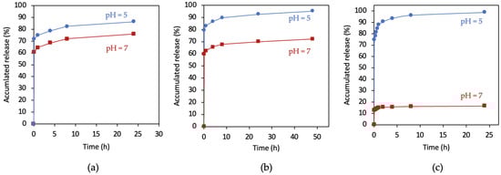Release profiles of ZIF-8-encapsulated CIP in neutral and acid media: (a) CIP/ZIF (0.007 mg/mg); (b) CIP/ZIF (0.4 mg/mg); and (c) CIP/ZIF (2 mg/mg).