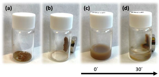 X-ray diffraction (XRD) was performed in a Bruker D8 DISCOVER diffractometer with DECTRIS PILATUS3R 100K Detector (Madrid, Spain). Samples were placed between glass panels and compressed into thin layers to avoid noise in the XRD pattern. A step size of 2θ 0.02° was used in the irradiation to obtain diffractograms of 5° < 2θ < 50°. The simulated crystal information for the magnetite (Fe3O4) was provided by the Crystallography Open Database (COD) with its corresponding COD number and was plotted by VESTA software together with the experimental XRD patterns. The infrared spectra were determined in a Fourier-Transform Infrared Spectrometer, JASCO 6200 (Tokyo, Japan), with SPECTRA MANAGER v2 software, using the Attenuated Total Reflectance (ATR) accessory. A small amount of sample was placed on the measurer and compressed using a diamond-tipped endless screw. An average of 64 scans were gathered for each spectrum from 420 to 4000 cm−1 at a nominal resolution of 1 cm−1. Thermogravimetric analyses (TGAs) were obtained in a TGA-50H SHIMADZU (Greifensee, Switzerland) thermogravimetric analyzer with vertical design and maximum precision of 0.001 mg. The samples were ground and dried in the furnace at 60 °C overnight before the analysis. TGA diagrams were obtained in air atmosphere, with a heating ramp of 5 °C/min up to 950 °C. SEM images were captured in a HITACHI S-510 Scanning Electron Microscope (Austin, TX, USA) with a Röntec, M Series Edwin, Si EDX detector, (Li). A small amount of powdered material was dropped onto a carbon tape on the SEM support, and the sample adhering to the carbon tape was then dried in the furnace and coated in gold.
