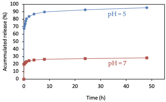 Initial drug release was greater (by up to 80%) and more abrupt at an acid versus a neutral pH. This would be a suitable profile for diseases that course with cell acidification and require a first shock dose followed by a lower maintenance dose but not for those requiring the release of a given dose over time. However, the system could be optimized for the latter, avoiding the explosive initial release through functionalization with hydrophobic groups or groups that promote stronger bonds with the drug.