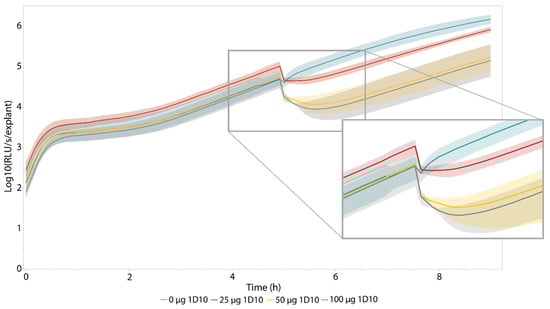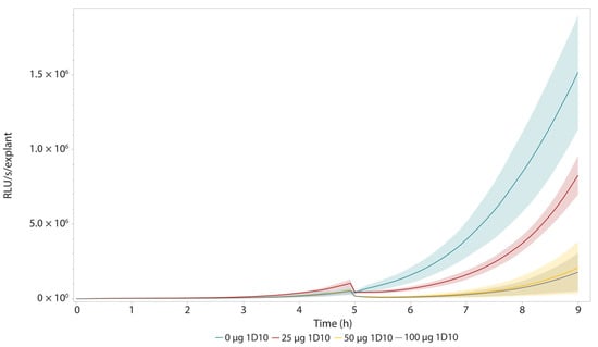 | Treatment | Relative Drop in Luminescence (%) | p-Value | Time to Reach Minimum (h) | p-Value | Area under the Curve (t5–t9) (×102) | p-Value |