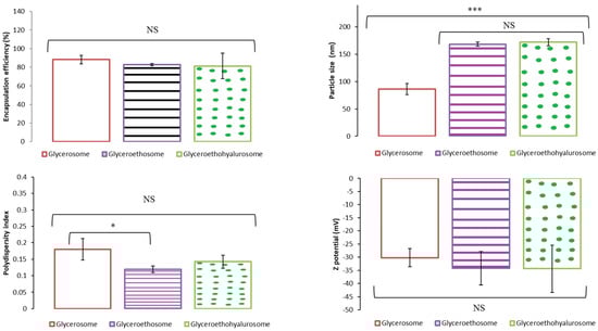 Figure 2 shows the encapsulation efficiency, size, polydispersity index and Z potential results obtained as the mean and standard deviation of three replicates of the three batches tested for glycerosomes, glyceroethosomes and glyceroethohyalurosomes. As can be observed, the percentage of mometasone furoate-loaded in each of the types of nanovesicles was between 88.19% and 81.33%, with no statistically significant differences among them. Moreover, glycerosomes were the system with the smallest size compared to glyceroethosomes and glyceroethohyalurosomes (p < 0.001), although in all cases nanoliposomes were obtained. In terms of polydispersity index, and despite the statistically significant differences observed among nanovesicles, the value is always lower than 0.2, showing the high homogeneity of the systems. Finally, the Z potential of the three types of formulation does not show significant differences among them (p > 0.05) and in all cases were highly negative.