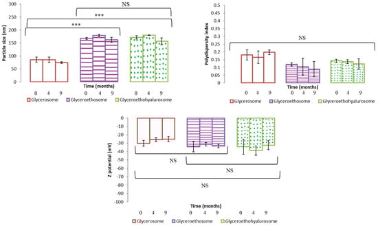 Mean particle size, polydispersity index and Z potential of selected mometasone furoate-loaded vesicles measured during 9 months of storage at 4 °C. Data are represented as the mean values ± standard deviations (n = 3). (NS no significative differences; *** p < 0.001.)