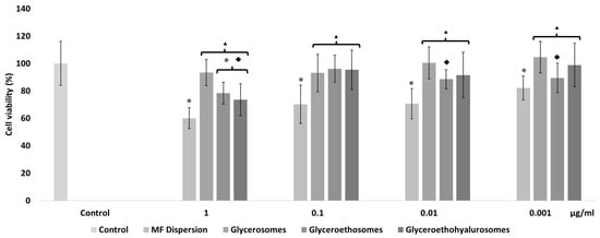 Cell viability of keratinocytes treated for 48 h with mometasone furoate in dispersion or loaded in vesicles diluted to reach 1, 0.1, 0.01, and 0.001 μg/mL of drug. Data are reported as the mean values ± standard deviations of cell viability expressed as the percentage of untreated cells (100% of viability). The symbol * indicates values that were statistically different from control; the symbol ▴ indicates values that were statistically different from mometasone furoate dispersion; the symbol ◆ indicates values that were statistically different from glycerosomes (p < 0.05).