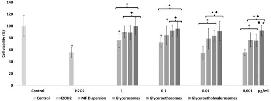 Viability of keratinocytes stressed with hydrogen peroxide and protected with mometasone furoate in dispersion or loaded in vesicles properly diluted to reach 1, 0.1, 0.01, and 0.001 μg/mL of drug. Data are reported as the mean values ± standard deviations of cell viability expressed as the percentage of untreated cells (100% viability). The symbol * indicates values that were statistically different from control; the symbol ▴ indicates values that were statistically different from hydrogen peroxide; the symbol ◆ indicates values that were statistically different from mometasone furoate dispersion; the symbol ■ indicates values that were statistically different from glycerosomes; the symbol ★ indicates values that were statistically different from glyceroethosomes (p < 0.05).