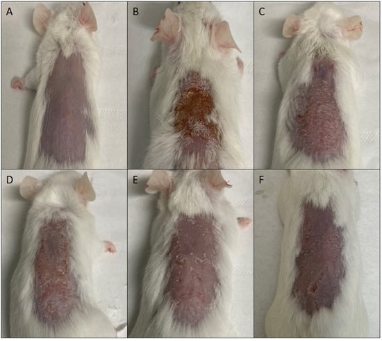Representative images of mouse skin: untreated (A), damaged by TPA and treated with saline solution (B) or treated with mometasone furoate commercial cream (C), or mometasone furoate loaded in glycerosomes (D), glyceroethosomes (E) and glyceroethohyalurosomes (F).