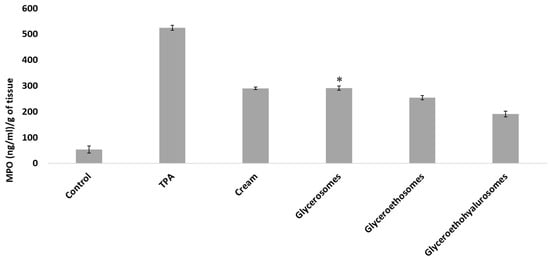Myeloperoxidase activity was measured to evaluate the entity of inflammation at skin level. Results are shown in Figure 7. The MPO concentration in the untreated tissue was ~50 (ng/mL)/gof tissue, that of inflamed by TPA application and treated with saline solution was ~520 (ng/mL)/gof tissue. The treatment with the same MF dose incorporated in a commercial cream, glycerosomes and glyceroethosomes determined a decrease in the skin inflammation, as the MPO concentration were ~290 (ng/mL)/gof tissue for the cream and glycerosomes and ~250 (ng/mL)/gof tissue for glyceroethosomes. The most significant reduction in myeloperoxidase was observed when mice were treated at the same conditions and MF dose with glyceroethohyalurosomes, as MPO concentration was ~190 (ng/mL)/gof tissue. A possible explanation for this observation could be that hyaluronic acid may improve the vesicle bioadhesiveness as well as act as a targeting moiety to CD 44 epithelial cells, overexpressed in inflammatory tissues [41,42].