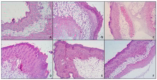 Representative images of the histological determination of mouse skin: untreated (A), damaged by TPA and treated with saline solution (B) or treated with mometasone furoate commercial cream (C), furoate loaded in glycerosomes (D), glyceroethosomes (E) and glyceroethohyalurosomes (F).