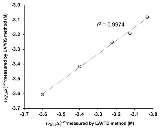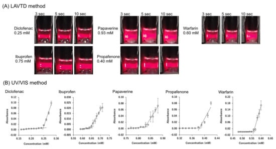 In LAVTD, the turbidity of a solution was detected by visual inspection. However, visual detection could cause a measurement error. To validate LAVTD, turbidity measurements were also performed by UV/VIS spectrometry for several drugs (diclofenac, ibuprofen, papaverine, propafenone, and warfarin). The photograph of the LAVTD method and the absorbance vs. concentration profiles measured by the UV/VIS spectrometry are summarized in Figure 2. The value was determined as the concentration intercept value. The of diclofenac, ibuprofen, papaverine, propafenone, and warfarin were determined as 0.25 ± 0.00 mM, 0.64 ± 0.01 mM, 0.83 ± 0.00 mM, 0.38 ± 0.00 mM, and 0.56 ± 0.00 mM, respectively by the UV/VIS method. The values measured by LAVTD were almost identical to those measured by the UV/VIS method (Figure 3). The coefficient of determination was 0.997.