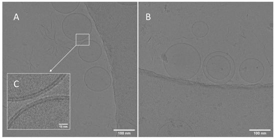 Cryo-TEM was conducted to directly observe these drug-rich metastable regions generated by niclosamide ASD in FaSSIF, as shown in Figure 1, as other more common techniques, such as nanoparticle tracking analysis and scanning electron microscopy, were unable to successfully resolve the nanoparticles. Surprisingly, the nanoparticles were spherical, similar to the ones previously reported in the literature [11,12,30]. Furthermore, the particles were surrounded by a bilayer membrane structure of approximately 4.5 nm (Figure 1C). These are in agreement with the bilayer structures generated by FaSSIF that were reported by Clulow et al. (2017). They proved that FaSSIF media forms vesicles of 30–50 nm with bilayer membranes of approximately 5 nm in thickness using cryo-TEM. The bilayer membrane had a similar thickness to that measured for the niclosamide ASD particles [31]. Previously, we reported FaSSIF particles of ~66 nm, measured by dynamic light scattering (DLS) [26]. These are in agreement with the sizes reported by Khoshakhlagh et al. (2015), Kabedev et al. (2021), and Kloefer et al. (2010) of 70, 75, and 30–70 nm nanostructures using DLS, respectively [32,33,34]. These varieties of nanostructures were identified as vesicles, spherical-mixed micelles, disk micelles, and liposomes by cryo-TEM [31,34].