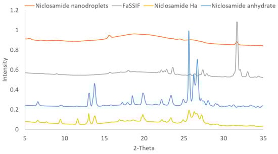 After confirmation and elucidation of the nanoparticle morphology by cryo-TEM, further solid-state characterization of the nanoparticles was performed to determine if the particles were amorphous resulting from LLPS or if they were crystalline formed from supersaturation during dissolution. As seen in Figure 2, WAXS confirms that the nanoparticles were amorphous with only crystalline peaks from the FaSSIF matrix being detected in the sample. No crystalline peaks from the niclosamide anhydrate or niclosamide Ha (hydrate form A) were detected. Importantly, niclosamide is characterized as a poor glass former, which means that it has a high tendency for recrystallization [35]. Niclosamide tends to recrystallize by forming strong hydrophobic π-π interactions [36]. Consequently, Figure 1 and Figure 2 demonstrate that niclosamide can avoid recrystallization by generating these amorphous nanoparticles that can act as reservoirs to increase its oral bioavailability. This formulation strategy can facilitate the development of amorphous solid dispersions containing other poor glass formers. However, these efforts cannot be achieved if the ASD is not effectively translated into a finished dosage form that can be administered to patients. As such, the next challenge is to prevent the recrystallization of niclosamide in the ASD when exposed to acidic conditions that occurs as the dosage form transits through the stomach.