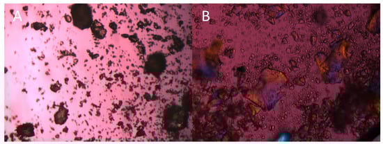 (A) Polarized light microscopy of ASD granules (10×); (B) same granules 5 min after receiving drops of 0.1 N HCl (20×). The first signs of recrystallizations were observed in less than 1 min.