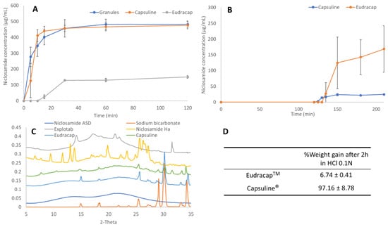(A) Dissolution profile of niclosamide ASD granules (280 mg), Capsuline, and Eudracap capsules (400 mg of 25% sodium bicarbonate, 5% Explotab®, and 70% ASD) (n = 3); (B) pH-shift dissolution test of the Capsuline and Eudracap capsule formulation; (C) WAXS data of filling material contained in the Capsuline and Eudracap capsules after exposure for 2 h in 0.1 N HCl; (D) acid uptake test of the capsules after 2 h in 0.1 N HCl.