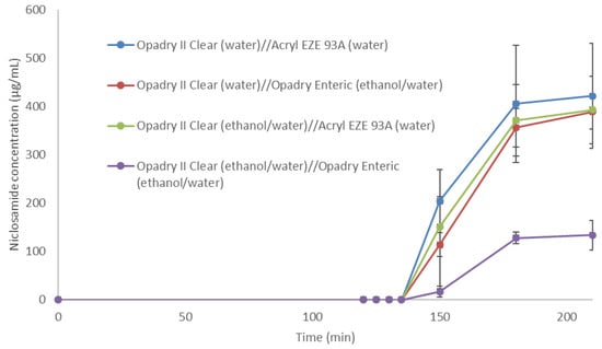 The enteric-coated tablets were prepared by first admixing 66.63% niclosamide ASD granules, 13.1% microcrystalline cellulose (Ceolus® PH-102, Asahi Kasei Chemical Corporation, Tokyo, Japan), 8.8% croscarmellose sodium (KiccolateTM, Nichirin Chemical Industries, LTD., Dojima, Japan), 0.28% magnesium stearate (Spectrum Chemical, New Brunswick, NJ, USA), and 11.1% sodium chloride (Fisher Chemical, Ottawa, ON, Canada). The blend was filled into a hopper placed on a Stoke F4 Press. The tablet cores were produced using a 10 mm round standard cup tooling and with a target final tablet core weight of 428 mg. Then, the tablet cores were added to a Vector LDCS-Hi Coater (Vector Corporation, Marion, IA, USA). Opadry II Clear (Colorcon, West Point, PA, USA) dispersion in either water or 20:80 water/ethanol mixture was used for seal coating to a target weight gain of 3%. Then, the sub-coated tablets were enteric coated with either a completely water-based coating (Acryl-EZE® 93 A, Colorcon, West Point, PA, USA) or a mixture of water and ethanol-based coating (Opadry® Enteric, Colorcon, West Point, PA, USA) to a target 10% weight gain.