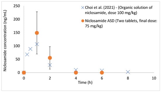 Plasma concentrations of niclosamide in beagle dogs after administering the enteric-coated tablets containing niclosamide ASD (n = 5). Error bars represent standard deviation. The data from Choi et al. (2021) were added to the chart as a comparison [58]. The data were extracted from the publication using the software PlotDigitizer. Reprinted/adapted with permission from Ref. [58]. 2022, Elsevier.