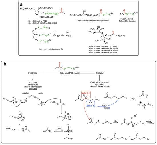 Notwithstanding the offered benefits, PS surfactants are associated with the drawback of chemical instability [66,67,68,69] because of the hydrolysis of the ester bond, auto-oxidation, and cleavage of the ethylene oxide subunit [4,68,70,71,72,73,74,75,76,77,78,79,80].