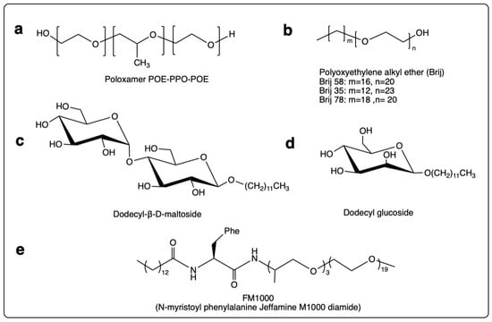 Chemical structures of potential surfactant PS alternatives devoid of an ester bond: (a) Poloxamer, (b) Polyoxyethylene alkyl ether (Brij), (c) Dodecyl-β-D-maltoside, (d) Dodecyl glucoside, and (e) N-myristoyl phenylalanine Jeffamine M1000 diamide (FM1000).