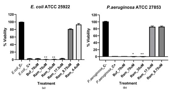 Endpoint assay to determine the viability percentage of Gram-negative bacteria after 19 h of treatment with Ramosin at concentrations of 4.37 μM, 8.75 μM, 17.5 μM, 35 μM, and 70 μM by broth microdilution assay. (a) E. coli (b) P. aeruginosa. Buf: Buforin II. C−: bacteria without treatment C+: bacteria treated with NaClO 0.012%. Absorbance reading at 600 nm. Three independent experiments were carried out for each bacterial strain. Data are presented as mean ± SD. *: p < 0.05, **: p < 0.01.