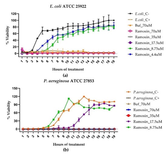 In the endpoint tests, it was observed that Ramosin had an antibacterial effect on both strains of Gram-negative bacteria. In these endpoint assays, comparisons were made of the percentages of viability of the bacteria evaluated and the different concentrations of Ramosin, using Kruskal–Wallis H-tests and multiple comparisons using Mann–Whitney U-tests with Bonferroni correction. For E. coli, it was observed that there is a decrease in the percentage of viability of the bacteria after treatment with the peptide from a concentration of 17.5 μM. This decrease is statistically significant for the concentrations of 17.5 μM, 35 μM, and 70 μM (p < 0.05). The inhibition observed is comparable to that obtained with the treatment with NaClO 0.012% (p < 0.05) or with Buforin II at 70 μM (p < 0.05) (Figure 1a).