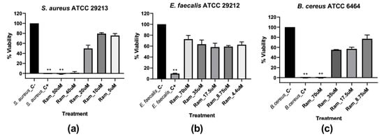 Endpoint assay to determine viability percentage of Gram-positive bacteria after 19 h of Ramosin treatment by broth microdilution assay. The bacteria S. aureus, E. faecalis, and B. cereus without treatment were used as a negative control, and NaClO at 0.012% was used as a positive control for death. (a) S. aureus ATCC 29213. (b) E. faecalis ATCC 29212. (c) B. cereus ATCC 6464. Absorbance reading at 600 nm. Three independent experiments were carried out for each bacterial strain. Data are presented as mean ± SD. **: p < 0.01.