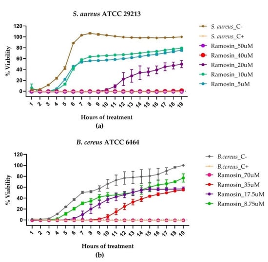 Growth inhibition kinetics of Gram-positive bacteria S. aureus and B. cereus treated with the Ramosin peptide from B. ramosi. Absorbance reading at 600 nm every hour of treatment. (a) S. aureus. (b) B. cereus. Three independent experiments were carried out for each bacterial strain. Data are presented as mean ± SD. C−: bacteria without treatment C+: bacteria treated with NaClO 0.012%.