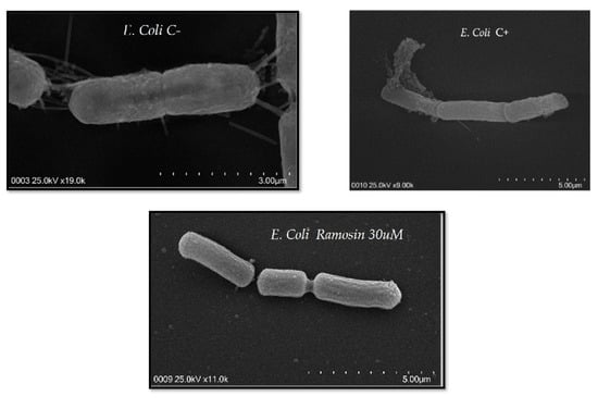 Scanning electron microscopy of the Gram-negative bacteria E. coli. Bacteria were treated with Ramosin peptide at 30 μM. C−: E. coli without treatment. C+: BTM-P1 peptide at 20 μM [].