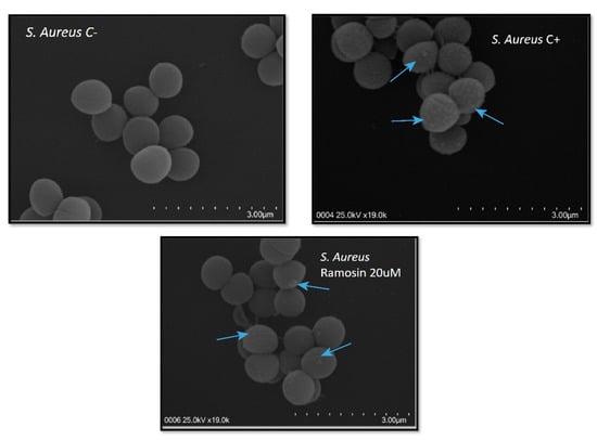 Scanning electron microscopy of the Gram-positive bacteria S. aureus. Bacteria were treated with Ramosin peptide at 20 μM. C−: S. aureus without treatment. C+: BTM-P1 peptide at 20 μM []. The blue arrows indicate the disturbances that occurred in the membrane of S. aureus.