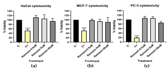 Screening test to determine the percentage of viability by the reduction of MTT in the cell lines (a) HaCat, (b) MCF-7, and (c) PC-3 treated with the Ramosin peptide at concentrations of 0.5 μM, 5 μM, and 50 μM for 24 h. C−: untreated cells. C+: cells treated with H2O2. Three independent experiments were carried out. Data are presented as mean ± SD. ****: p < 0.001.