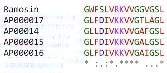 Alignment of the Ramosin peptide sequence from Bolitoglossa ramosi and the Aurein sequences reported in APD3: AP00017 (Aurein 2.4), AP00014 (Aurein 2.1), AP00016 (Aurein 2.3), AP00015 (Aurein 2.2) []. The asterisk (*) indicates positions which have a single, fully conserved residue. The colon (:) indicates conservation between groups of strongly similar properties and a period (.) indicates conservation between groups of weakly similar properties.