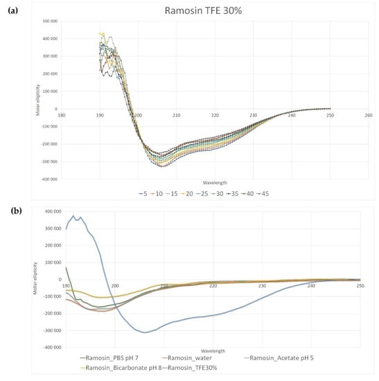 The analysis of the conformation of the Ramosin peptide was performed through circular dichroism (CD). CD spectroscopy was carried out on a JASCO J-815 CD Spectrometer (JASCO Corp., Tokyo, Japan) in the far ultraviolet (UV) range (190–250 nm), using quartz cuvettes (0.1 cm path length). Each CD spectra of the synthetic peptide was recorded, averaging three scans in continuous scanning mode. Solvent blank was subtracted from each sample spectrum. Molar ellipticity was calculated for each spectra using 250 µL of 2 mM peptide in 30% (v/v) 2,2,2-trifluoroethanol (TFE), water, phosphate buffered saline (PBS) 2 mM pH = 7.4, sodium bicarbonate buffer 1 M pH = 8.5, and sodium acetate 3 M pH = 5. Resulting data were analyzed using Spectra Manager software (Version 2.0, JASCO Corp., Tokyo, Japan) [,].