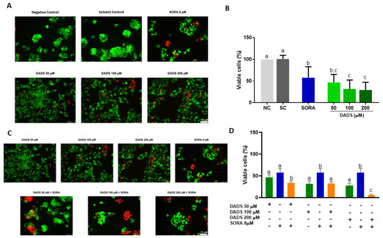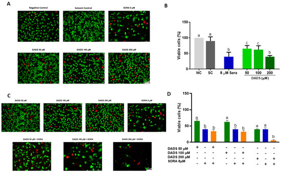 Cell viability of HepG2 cells treated with diallyl disulfide (DADS) and sorafenib (SORA). Representative images of HepG2 cells treated with DADS and SORA, either alone (A) or in combination (C). Calcein-positive cells (green) are viable; ethidium homodimer-positive cells (red) are dead. HepG2 cells were treated with DADS (50–200 μM) and SORA (8 µM), either alone (A,B) or in combination (C,D), for 72 h, and cell viability was assessed using the LIVE/DEAD® assay kit. NC: negative control (culture medium); SC: vehicle control (0.25% DMSO). Results are expressed as mean ± standard deviation (n = 3). Distinct letters indicate statistical significance (p < 0.05; ANOVA and Tukey’s post-test). Scale bar: 75 µm.