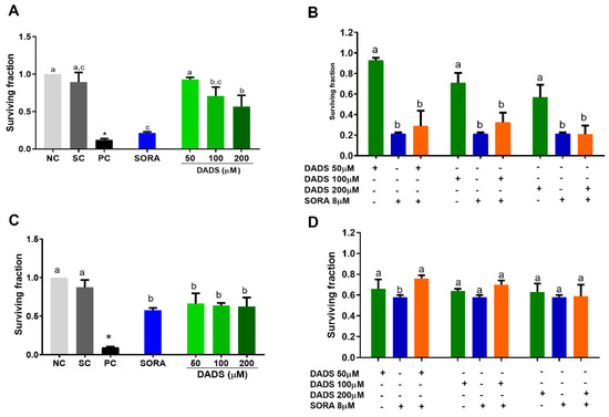 Compared with DADS alone, the combined treatment resulted in a lower survival fraction in the HepG2 cells, which was similar to the survival fraction of the cells treated with SORA alone. It means that SORA mediated the reduction in the survival fraction (Figure 3B).