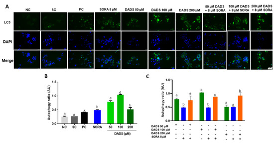 Cells under stress conditions such as the perturbation by pharmacological agents can trigger cellular mechanisms, such as autophagy, to maintain cell homeostasis. Conversely, autophagy has also been associated with autophagic (“type 2”) cell death in response to destructive conditions [36]. For this reason, we asked whether the mechanisms of cell death observed in the previous assays were related to autophagy by measuring the levels of LC3, a known marker of autophagy [37]. SORA and DADS, either alone or in combination, markedly augmented the LC3 levels in the HepG2 cells (Figure 4A). DADS at all the concentrations tested (50, 100, and 200 µM) increased the autophagy ratio in HepG2 cells. SORA (8 µM) and DADS (200 µM) alone similarly augmented the autophagy ratio (Figure 4B), but their combination increased the autophagy ratio the most effectively. The combination of 50 µM DADS and 8 µM SORA elicited an autophagy ratio similar to that induced by DADS alone. The combination of 100 µM DADS and 8 µM SORA induced an autophagy ratio that differed from that elicited by the other associated treatments, but it was lower than that induced by DADS alone (Figure 4C).