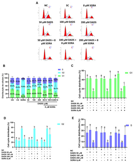 As the DADS and SORA combination decreased the survival fraction of the HepG2 cells, we asked how this inhibition of cell proliferation was associated with the cell cycle (Figure 5A,B). SORA alone decreased the percentage of cells in the G1 phase when compared to the negative control and the single treatments with DADS (Figure 5C). The combination of SORA and DADS at 50 and 100 µM showed similar percentages of cells in G1, both higher than SORA alone. The combination of SORA and DADS at 200 µM, however, showed a decreased percentage of cells in G1 compared with the concentrations of 50 and 100 µM, but it was also higher when compared with SORA alone (Figure 5C). Following the same trend, the combination of SORA and DADS at 50 and 100 µM showed similar percentages of cells in G2, both lower than SORA alone. The combination of SORA and DADS at 200 µM showed an increased percentage of cells in G2 compared with the concentrations of 50 and 100 µM, but it was also lower when compared with SORA alone (Figure 5D). Regarding the population of S-phase cells, all the combinations of SORA and DADS showed a similar percentage of cells in S phase, all of them higher than SORA alone (Figure 5E).