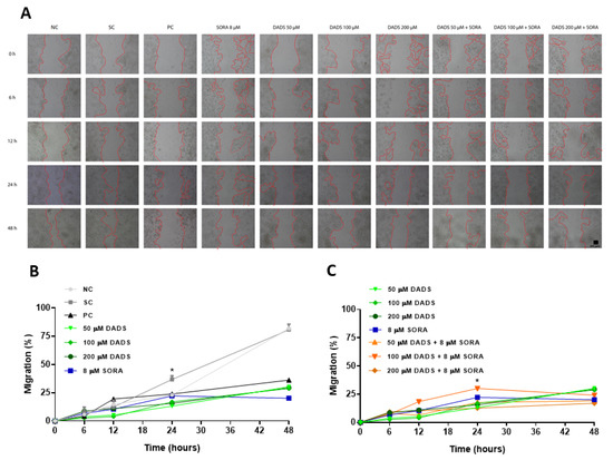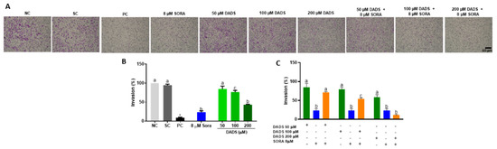 In addition to killing and inhibiting the proliferation of tumor cells, it is interesting that a drug also inactivates the potential of the tumor cell to migrate to other locations [38]. For this reason, we evaluated the capability of the combination of DADS and SORA to interfere with the migration and invasion of HepG2 cells (Figure 6 and Figure 7). Compared with the control, all the DADS and SORA concentrations tested significantly reduced the migration of HepG2 cells after 24 h, with no difference among the compounds (Figure 6A,B). The two compounds in combination inhibited the migration of HepG2 cells to the same extent as the compounds alone (Figure 6A,C).