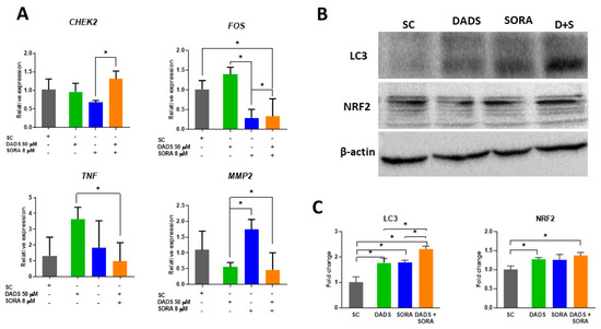 Autophagy was increased by the combined treatment (Figure 4). We explored this mechanism by measuring the protein levels of LC3, a marker protein for autophagic activity [37]. The LC3 protein levels were augmented in all groups when compared with the control; the treatment with DADS and SORA in combination increased the LC3 protein levels more strongly than the compounds alone (Figure 8B,C). NRF2 is a master regulator of the antioxidant response and is responsive to DADS [45]. Moreover, a loss of Nrf2 is associated with a reduction in autophagy [46]. We observed an increase in NRF2 expression in the cells treated with DADS alone or in combination with SORA when compared to the control cells (Figure 8B,C).