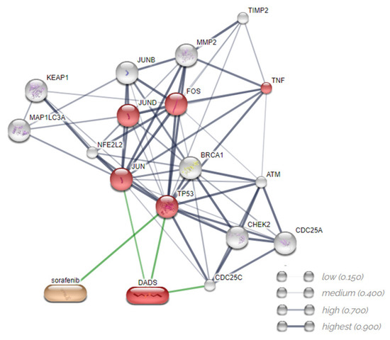 Predicted interactions among diallyl disulfide, sorafenib, genes, and proteins using the STITCH database. Gray lines represent interaction among proteins. Green lines represent interactions between compounds and proteins. Source: STITCH (http://stitch.embl.de/cgi/network.pl?taskId=nv9TPmaTyMjt (accessed on 30 August 2022).