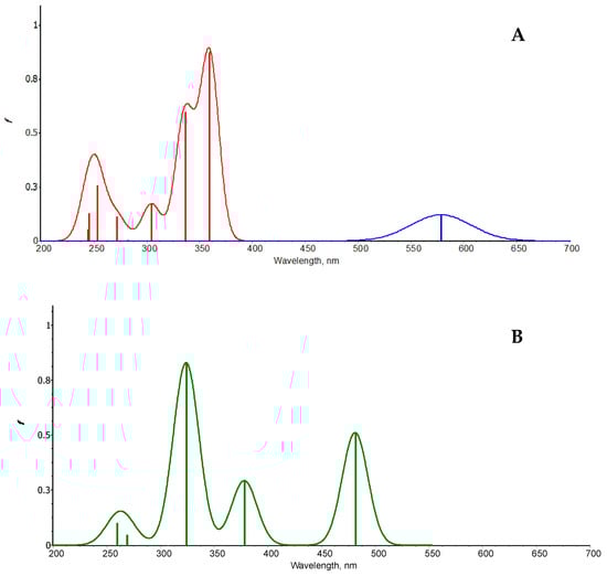 TDDFT simulated spectra of (A) H2L in DMSO. Red—absorption, blue—emission (after ESPT) and (B) HL− in DMSO. f is the oscillator strength.