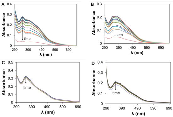 Aqueous stability tests with Cu(II) complexes 1:1 (A,C) and 2:1 (B,D) in the absence (A,B) and in the presence of equimolar amounts of BSA (C,D). The complexes’ concentration was ca. 25 µM with <1% DMSO and the measurements were done up to 24 h.