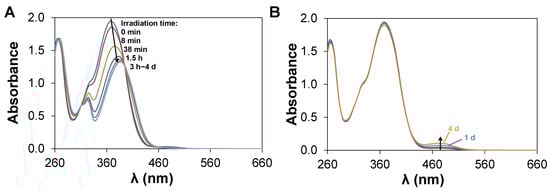 Time-dependent UV-vis spectra of the ligand in DMSO. (A) Irradiated continuously with diffuse light. (B) Protected from light. [cligand = 122 μM; ℓ = 2 mm; T = 25.0 °C].