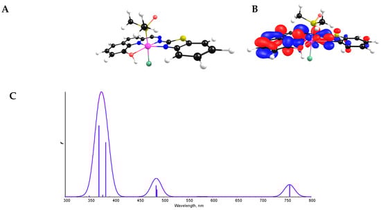 (A) DFT structure or the Ru complex, (B) LUMO orbital of the Ru complex and (C) corresponding absorption spectra.