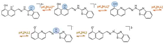 The condensation reaction of 2-carbaldehyde-8-hydroxyquinoline with 2-hydrazinobenzothiazole provided the ligand precursor, H2L, as shown in Figure 1. Since its characterisation has been already published by us [23], details are included in Supplementary Material and here we report only the new solution studies.