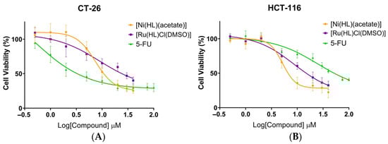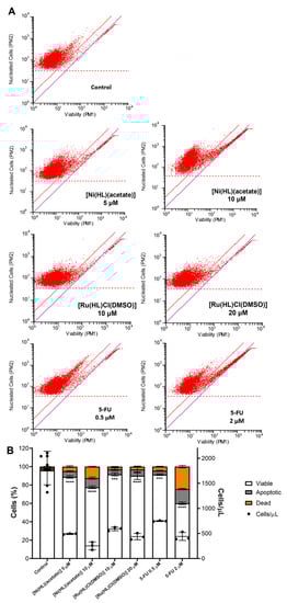For Guava ViaCount assay, cells were plated at a concentration of 1 × 105 cells/mL in 24-well plates (1 mL/well) and cultured for 24 h in the culture conditions described above [33]. CT-26 cells were incubated with [Ni(HL)(acetate)] or [Ru(HL)Cl(DMSO)] at concentrations of 5 and 10 μM or 10 and 20 μM, respectively. For the HCT-116 cell line, the tested concentrations were 5 and 7.5 μM, and 7.5 and 12.5 μM, respectively. The positive control group, 5-FU, was tested at 0.5 and 2 μM, and at 20 and 40 μM for CT-26 and HCT-116, respectively. Negative control group was constituted by cells in the presence of complete culture medium. After a 48 h incubation period, cell culture supernatants were collected, and adherent cells were detached using TrypLE™ Express (Invitrogen). Detached cells were then added to supernatants and the wells were washed using PBS with 2% FBS to recover any remaining cells. The recovered suspension was added to the previously collected cells and supernatants and centrifuged for 5 min at 650× g. The supernatants were discarded, and cells were suspended in PBS with 2% FBS. Then, on a 96-well plate, 20 μL of cell suspension was incubated with 180 μL of Guava ViaCount® reagent (Merck Millipore, Darmstadt, Germany) for 5 min at r. t. Using a Guava EasyCyte 5HT Flow cytometer (Guava Technologies, Inc., Hayward, CA, USA), data were collected and analysed with the ViaCount software module with the acquisition of 10,000 events per sample. GraphPad Prism®8 was used to analyse cell proliferation (GraphPad Software, San Diego, CA, USA). Two independent experiments were carried out, with three replicates per condition.