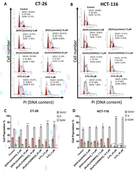 To understand the potential effects of [Ni(HL)(acetate)] and [Ru(HL)Cl(DMSO)] on cell cycle progression, CT-26 and HCT-116 cells were used [36]. Briefly, cells were plated at a density of 5 × 104 cells/mL in 6-well plates (2 mL) and allowed to grow for 24 h at 37 °C with 5% CO2. CT-26 cells were then incubated with [Ni(HL)(acetate)] or [Ru(HL)Cl(DMSO)] at concentrations of 5 and 10 μM or 10 and 20 μM, respectively. For HCT-116 cell line, the tested concentrations were 5 and 7.5 μM, and 7.5 and 12.5 μM for [Ni(HL)(acetate)] and [Ru(HL)Cl(DMSO)], respectively. The positive control group, 5-FU, was tested at 0.5 and 2 μM and 20 and 40 μM for CT-26 and HCT-116, respectively. Negative control group was constituted by cells in the presence of complete culture medium. After a 24 h incubation period, cells were collected by centrifugation at 850× g for 5 min at 4 °C, suspended in 500 µL of ice-cold PBS, and fixed with 500 µL ice-cold 80% ethanol (−20 °C), added drop-by-drop, under gentle mixing. Prior to the analysis, samples were kept at 4 °C for at least 16 h. On the day of data collection, cells were centrifuged at 850× g and suspended in PBS with 25 µg/mL PI (Fluka, Sigma-Aldrich) and 50 µg/mL RNase A (Sigma-Aldrich), then incubated at 37 °C for 30 min. The Guava easyCyte™ Flow Cytometer (Merck Millipore, Darmstadt, Germany) was used to collect the data corresponding to 10,000 events per sample. The ModFit LT™ 5.0 software was used to analyse the data and the percentages of cells in each cell cycle phase was determined (Verity Software House, Topsham, ME, USA).