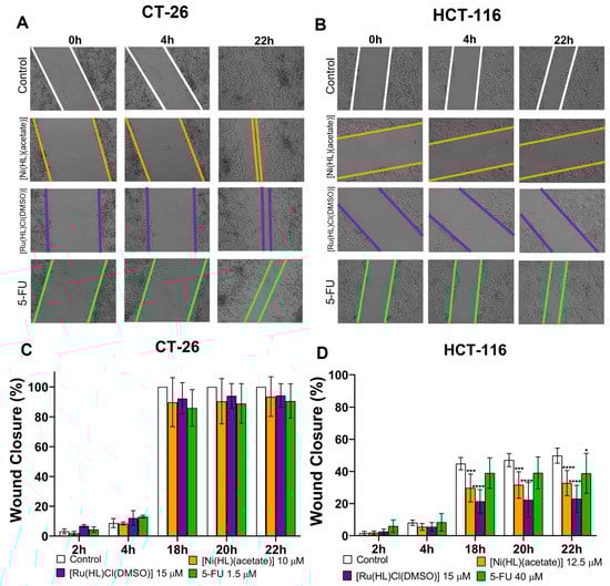 To assess cellular migration in the presence or absence of tested compounds, HCT-116 and CT-26 cells were plated at 1.5 × 105 and 3 × 105 cells/mL in a 12-well plate (1 mL/well) and were allowed to adhere and grow until reaching around 80–90% confluence [36,37]. A sterile 10 μL pipette tip was used to wound the cell monolayer, followed by a washing step with PBS to remove debris. Then, cells were incubated with the tested compounds suspended in RPMI-1640 (CT-26) or DMEM media (HCT-116) supplemented with 2% FBS and 100 IU/mL of penicillin and 100 μg/mL streptomycin (Gibco, Thermo Fisher Scientific, Waltham, MA, USA), and hereafter designated as RPMI 2% and DMEM 2%, respectively. Under the above mentioned culture conditions, CT-26 cells were incubated with [Ni(HL)(acetate)] or [Ru(HL)Cl(DMSO)] at concentrations of 10 and 15 μM, respectively. For the HCT-116 cells, the tested concentrations were 12.5 and 15 μM for [Ni(HL)(acetate)] and [Ru(HL)Cl(DMSO)], respectively. The positive control, 5-FU, was tested at 1.5 and 40 μM for CT-26 and HCT-116, respectively. Negative control group was constituted by cells maintained in RPMI 2% (CT-26) and DMEM 2% (HCT-116). Images of the wound closure were taken beneath the stage of a Zeiss Axiovert 200 inverted microscope, using a 10× objective and a digital camera (CoolSNAP EZ, Photometrics, Huntington Beach, CA, USA) and recorded by the Metafluor Software at 0, 2, 4, 8, 18, 20 and 22 h following cell monolayer scratching (Molecular Devices, Sunnyvale, CA, USA). ImageJ (https://imagej.net (accessed on 15 September 2022)) was used to analyse the images, and wound closure was normalised to the original wound area at time 0 h using Equation (2), where W0 represents the wound width at time 0 h and Wt represents the wound width at the studied timepoints. Three independent experiments were performed, with three replicates for each tested condition.