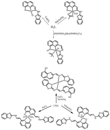 - Mohapatra, R.K.; Sarangi, A.K.; Azam, M.; El-ajaily, M.M.; Kudrat-E-Zahan, M.; Patjoshi, S.B.; Dash, D.C. Synthesis, structural investigations, DFT, molecular docking and antifungal studies of transition metal complexes with benzothiazole based Schiff base ligands. J. Mol. Struct. 2019, 1179, 65–75. [Google Scholar] [CrossRef]
