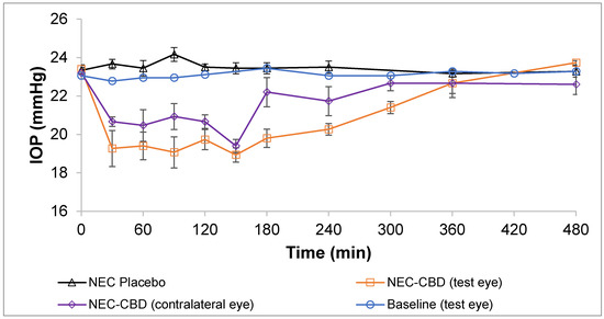 IOP vs. time profile following topical administration of CBD-NEC (treated eye and contralateral eye), NEC placebo (treated eye), and baseline of left eye in Dutch Belted male rabbits (mean ± SEM, n = 6).