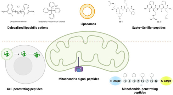 Mitochondria signal peptides (MSPs) or mitochondria-targeting sequences (MTSs) are normally used to import proteins synthetized in ribosomes within mitochondria [117]. These MSPs or MTSs can be conjugated to nonmitochondrial compounds to form chimeric molecules that are specifically recognized by mitochondrial import machinery, selectively delivering to the intermembrane space, inner membrane, or matrix [117].