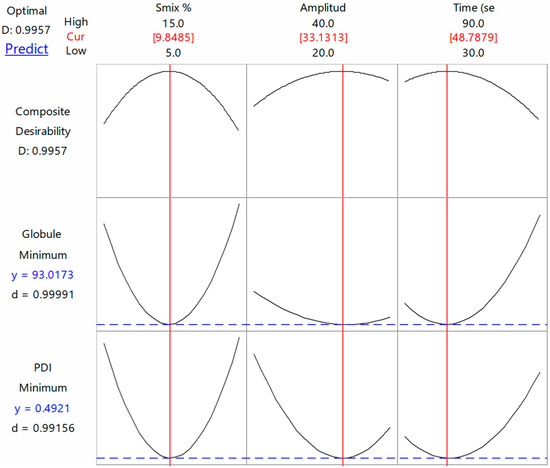 The model’s significance was determined using ANOVA, the lack of fit test, and the multiple correlation coefficient (R2) test. For a significant fit of the model to the quadratic equation, the model p-value should be less than 0.05. Data variation around the fitted value is assessed by the lack of fit test and it should be not significant (p-value > 0.05) in comparison to the pure error. The R2 value reflects the degree of variance around the mean (multiple correlation coefficient test) and it should be close to one. In addition, the numerical optimization process by means of the desirability function was employed to choose the optimum NE [37,38,39].