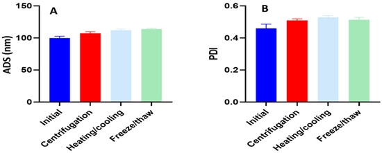 The optimized TAD nano-emulsion (OTN) was subjected to six cycles between refrigeration at 4 °C and heating to 45 °C with storing for 48 h. OTN was further centrifuged at 3500 rpm for 30 min. Finally, OTN was subjected to freeze–thaw cycles (n = 3) at −21 °C and 25 °C, with storage at each temperature for 48 h [43,44]. After each test of stability evaluation, samples of OTN were checked for instability signs such as phase separation or precipitation and also tested for ADS and PDI, as described in Section 2.4.1 [39].