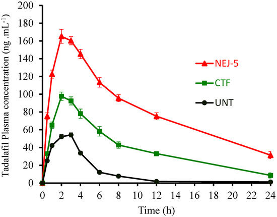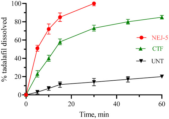 Dissolution of the optimized NEJ formulation was carried out using USP type 2 (Paddle) apparatus in 1000 mL 0.1 N HCl kept at 37 ± 0.5 °C and RPM equal to 100 [6,55]. Unprocessed TAD (UNT) and a commercial tablet formulation containing 2.5 mg TAD (CFT) were also evaluated for their dissolution profiles using the same method to obtain comparative data. Samples of 5 mL were withdrawn from the dissolution medium (n = 3) periodically and amount of released TAD was estimated by the previously explained HPLC procedures (Section 2.1.1).